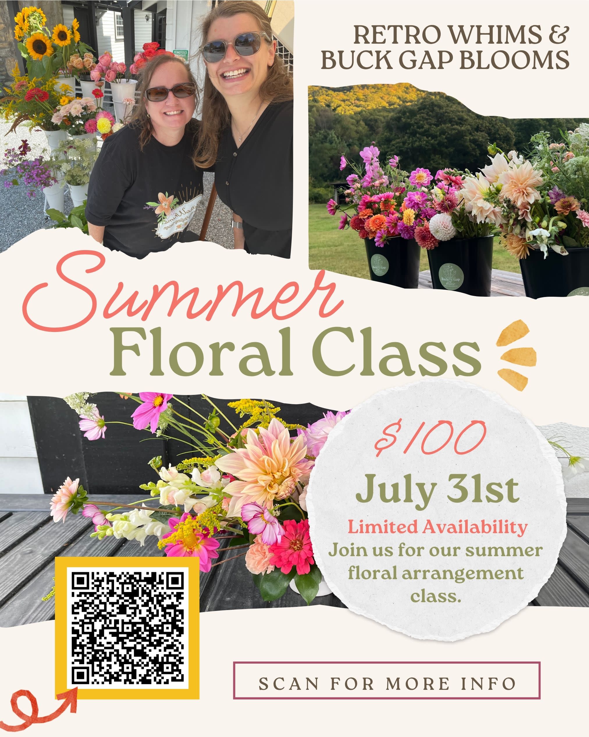 Join us at Buck Gap Blooms with host RetroWhims. Unleash your creativity with seasonal blooms guided by expert florists. Register at buckgapblooms.com